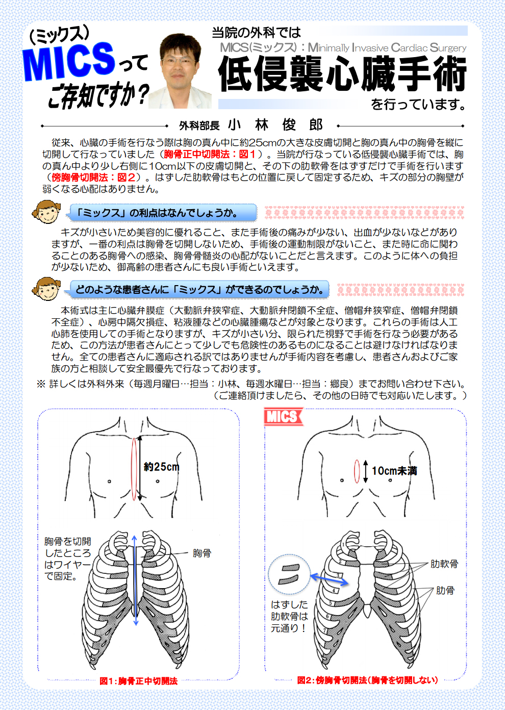弁膜症に対する低侵襲手術(Minimally Invasive Cardiac Surgery: MICS:ミックス)を行なっています。